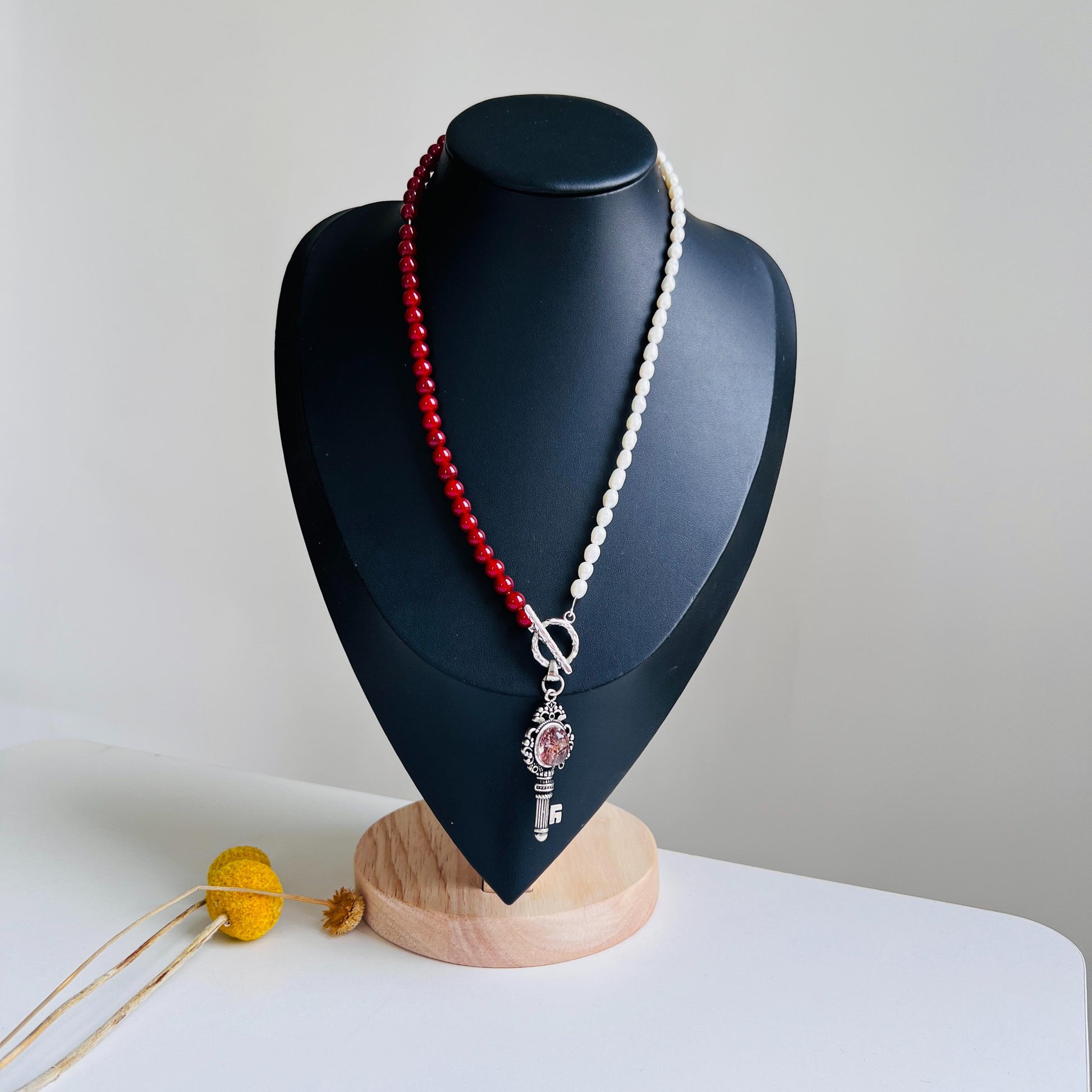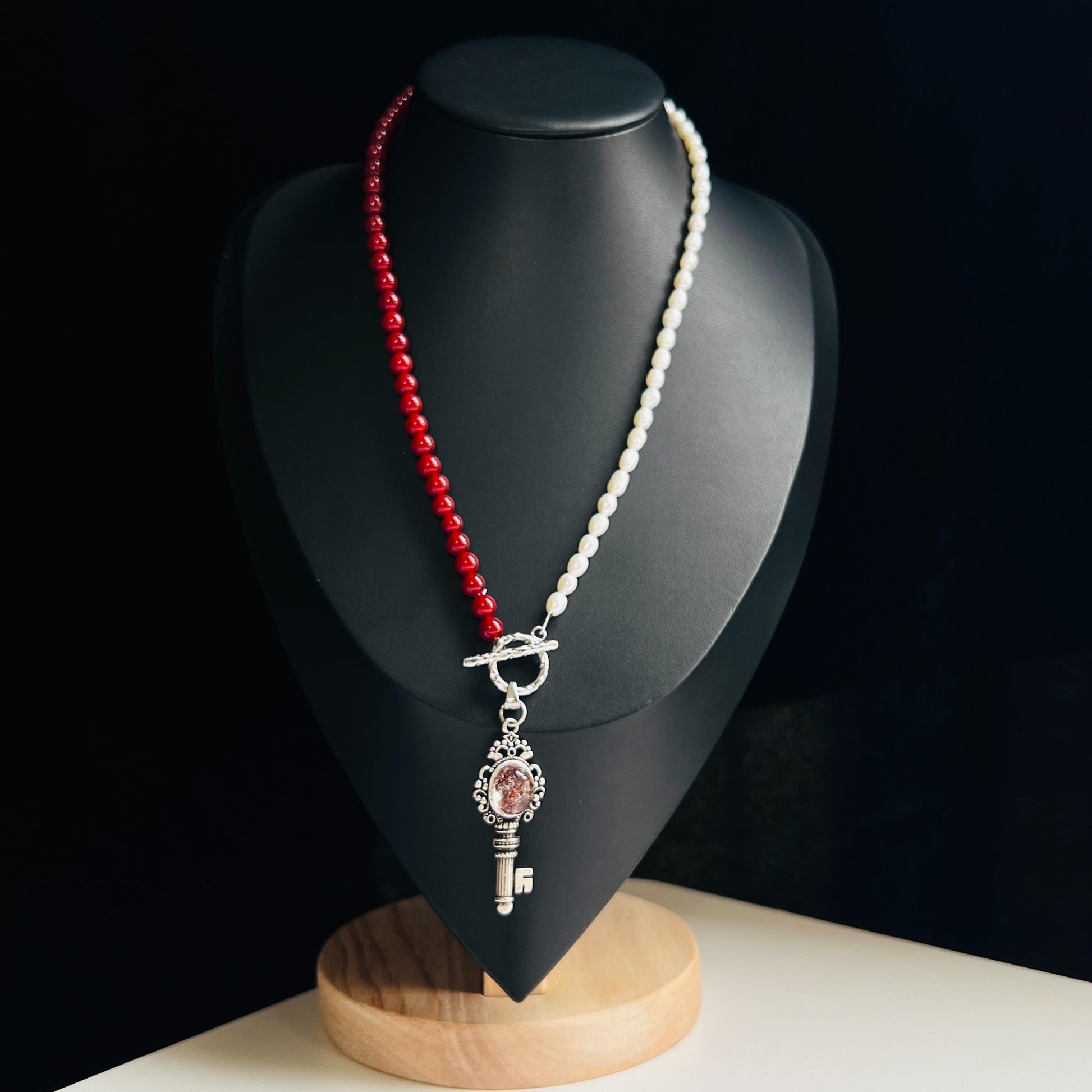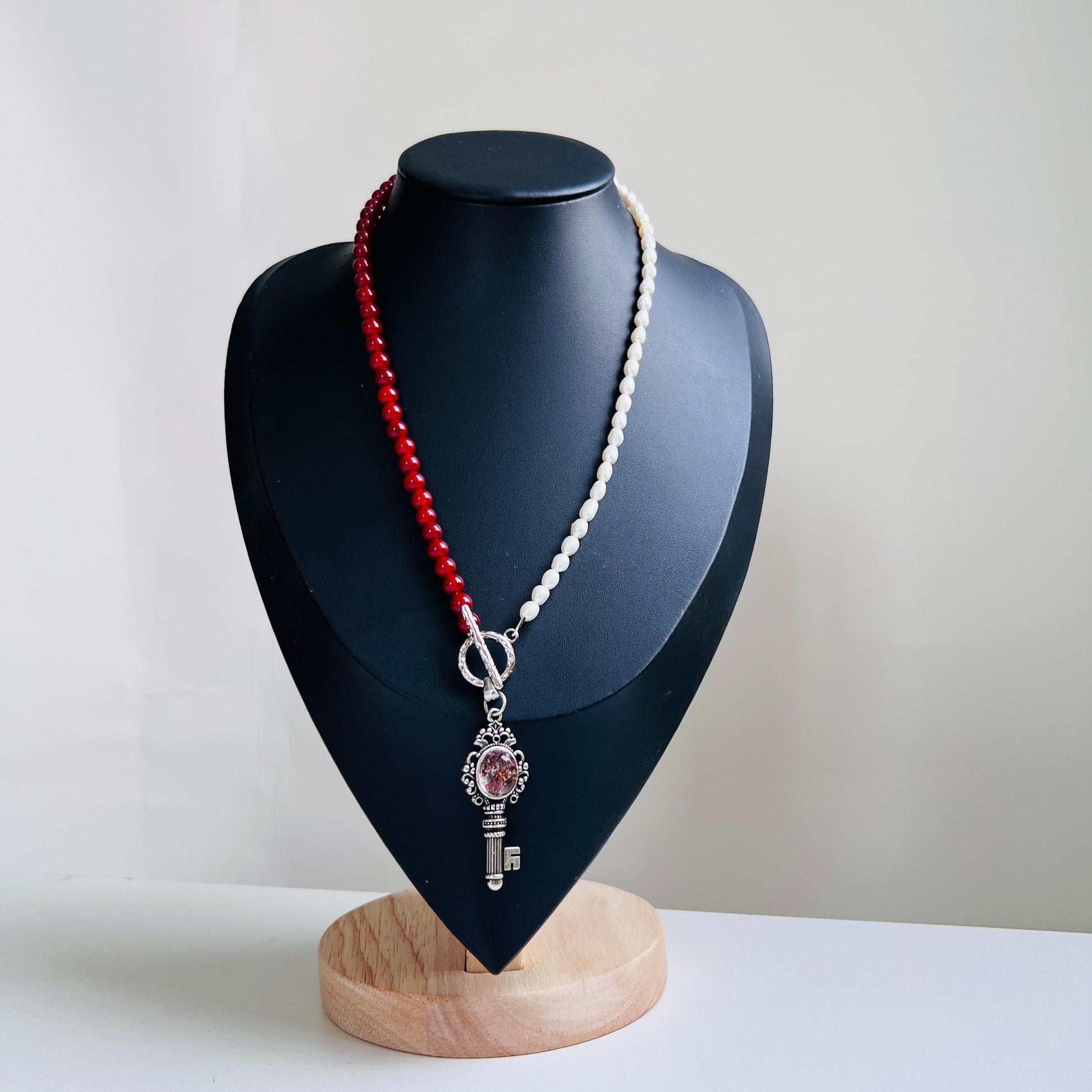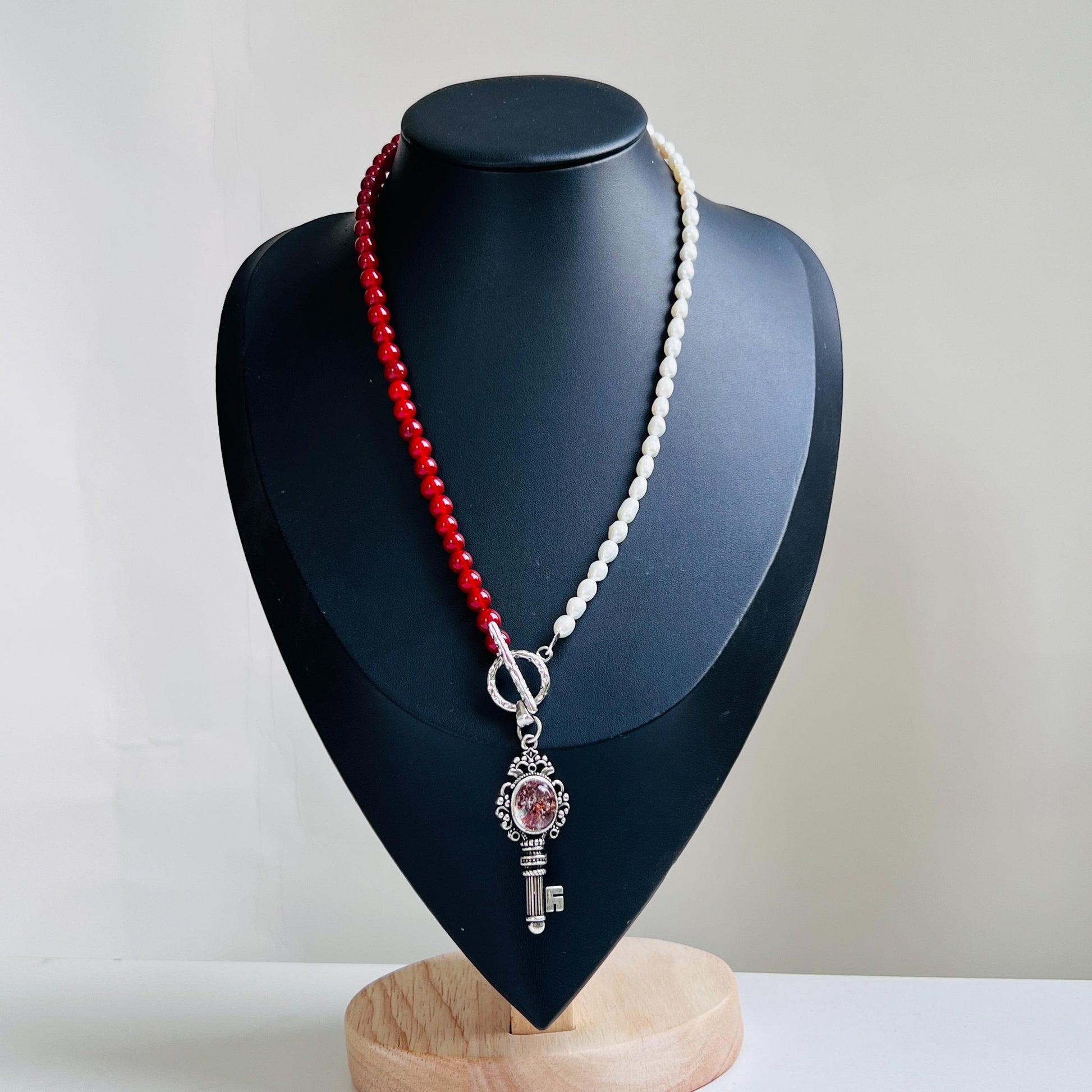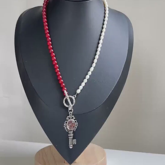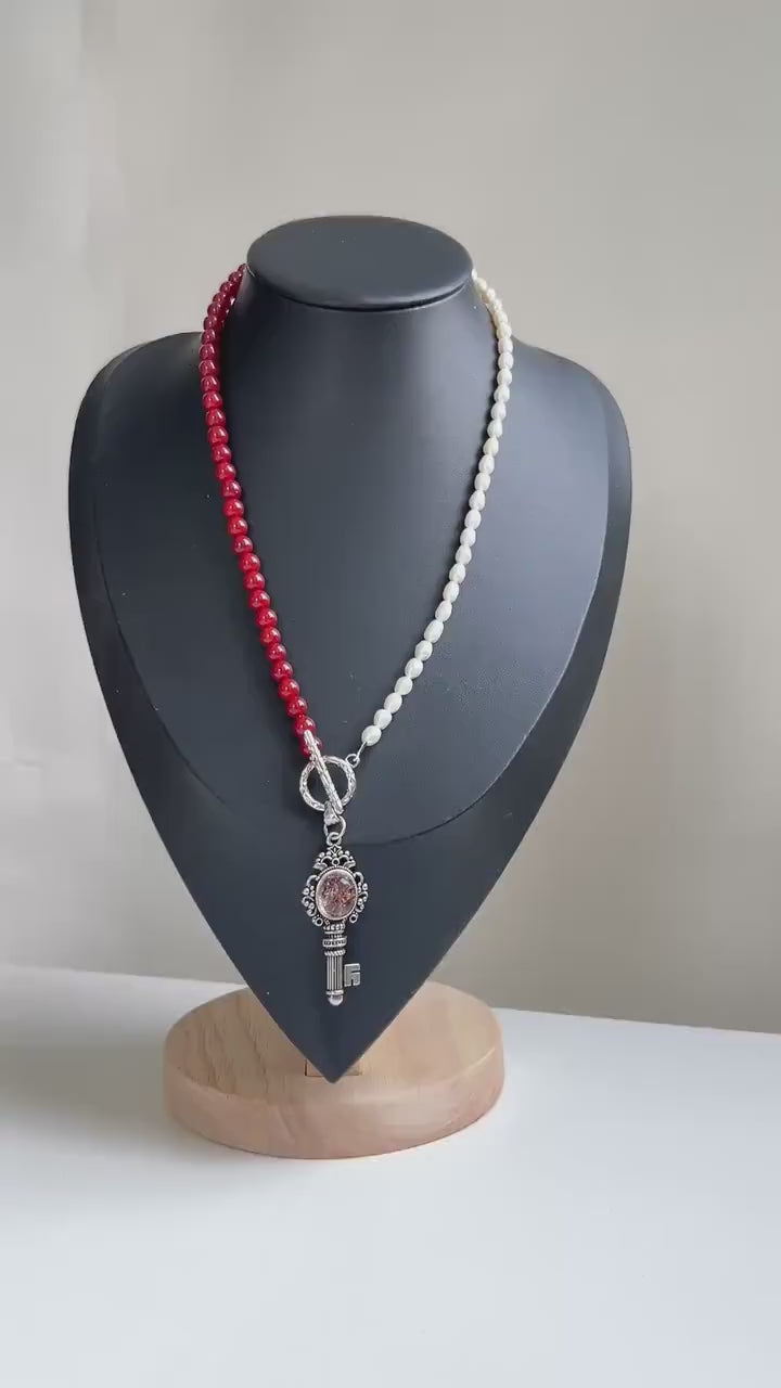 Diese handgefertigte Halskette vereint klare Symbolik, spirituelle Energie und feminine Eleganz in einem ausdrucksstarken Design. Die asymmetrische Anordnung aus tiefroten Achatperlen auf der einen Seite und natürlichen Süßwasserperlen auf der anderen Seite verleiht der Kette eine starke visuelle Balance. Im Mittelpunkt steht ein antiker Schlüsselanhänger, besetzt mit einem roten Phantomquarz, der als spirituelles Zentrum und energetischer Fokus wirkt. Die ungewöhnliche Komposition von Rot und Weiß macht dieses Schmuckstück einzigartig und kraftvoll - perfekt für Frauen mit einem Sinn für Tiefe und Individualität.