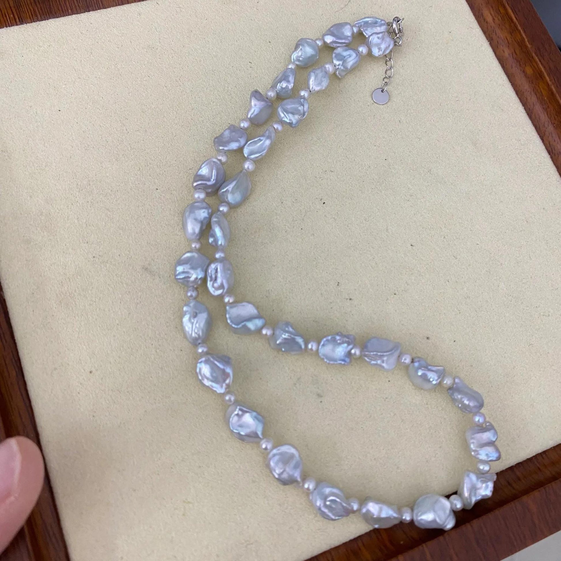 Handgefertigte silberblaue Barock Keshi Süßwasserperlenkette, unregelmäßige Nugget Perlen, natürliche Schmuck Geschenkidee