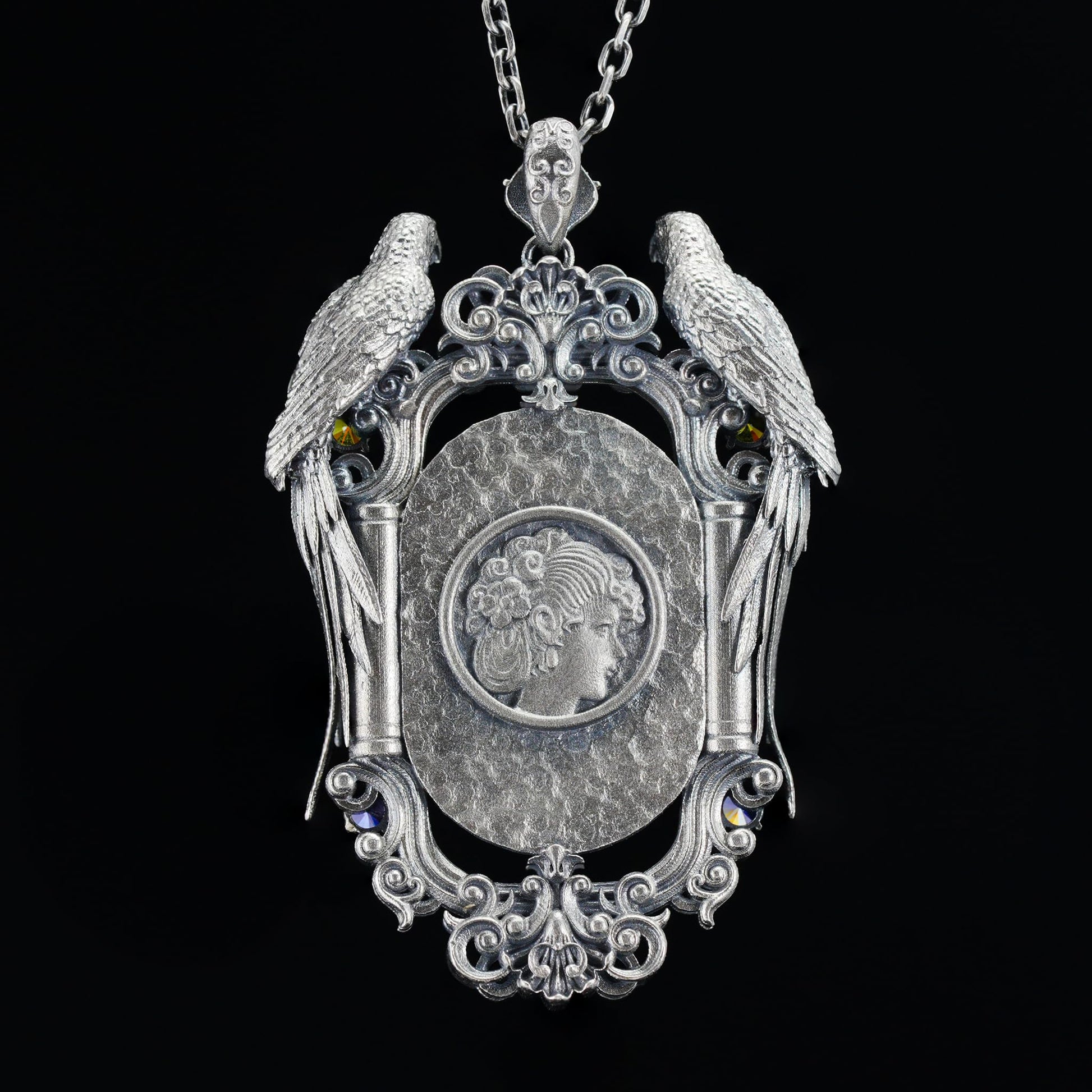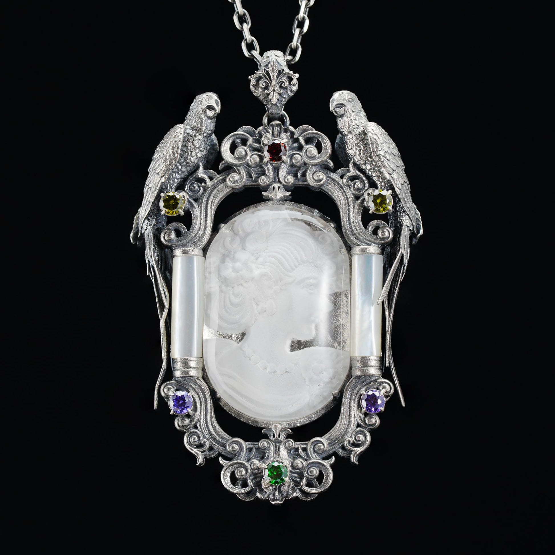 Handmade 925 Silver Victorian Cameo Necklace | Baroque Pendant with Two Parrots | Girl Relief in Rock Crystal | Vintage Craft