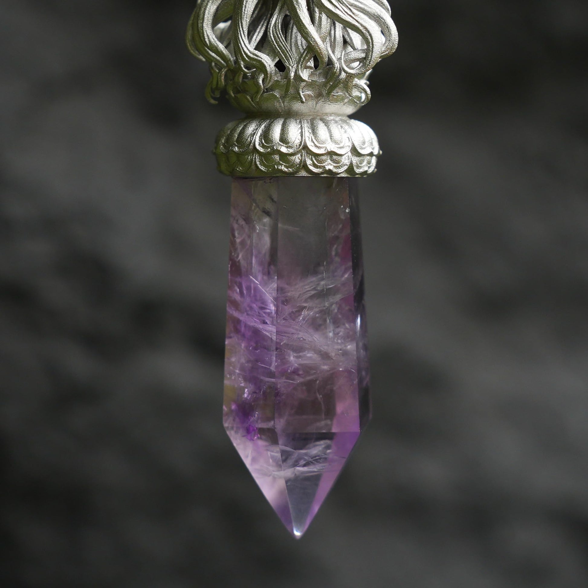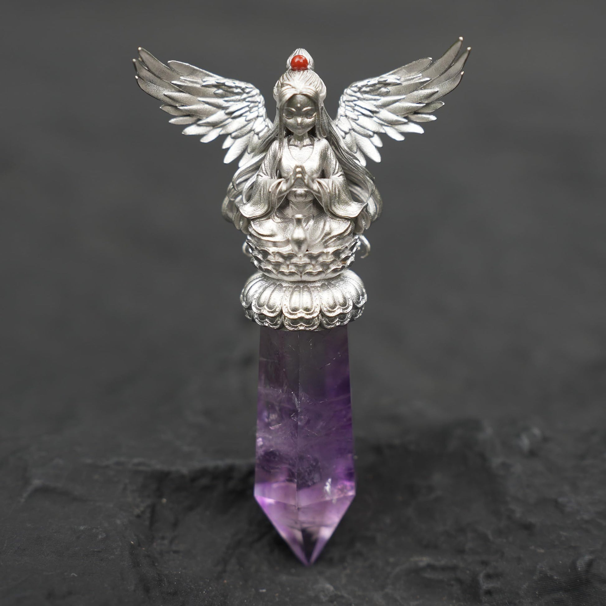 We have embodied this image into this pendant – intricately carved from 925 silver with a lively figure, paired with a natural amethyst pillar that serves as a spiritual guide, helping to balance emotions, cleanse energy fields, and enhance meditation focus.