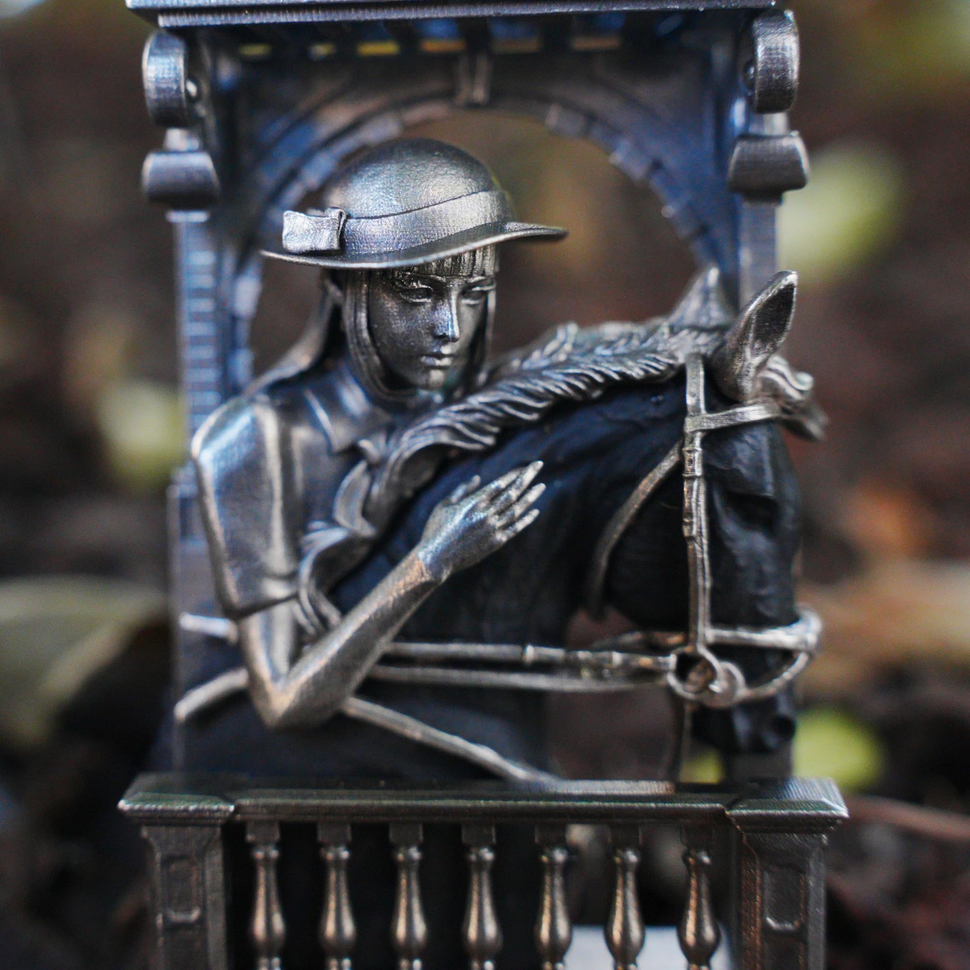 In front of an ancient arched window, a girl gently strokes the mane of a silent black horse. The horse is carved from black jade, smooth like an old dream, steady as memory itself. Her bowed head and gentle expression feel like a farewell, or a recollection of a deeply held emotion.