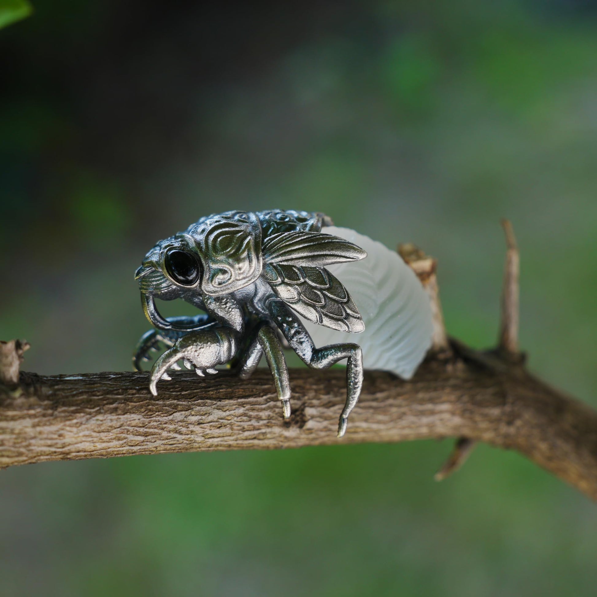 This pendant captures that instant: silver wings and jointed limbs clutch the twig; the abdomen holds a clear white crystal like moonlight resting on a leaf vein; a pair of black onyx eyes gaze quietly — reminding us that true growth is the light step forward after long waiting. 🍃✨