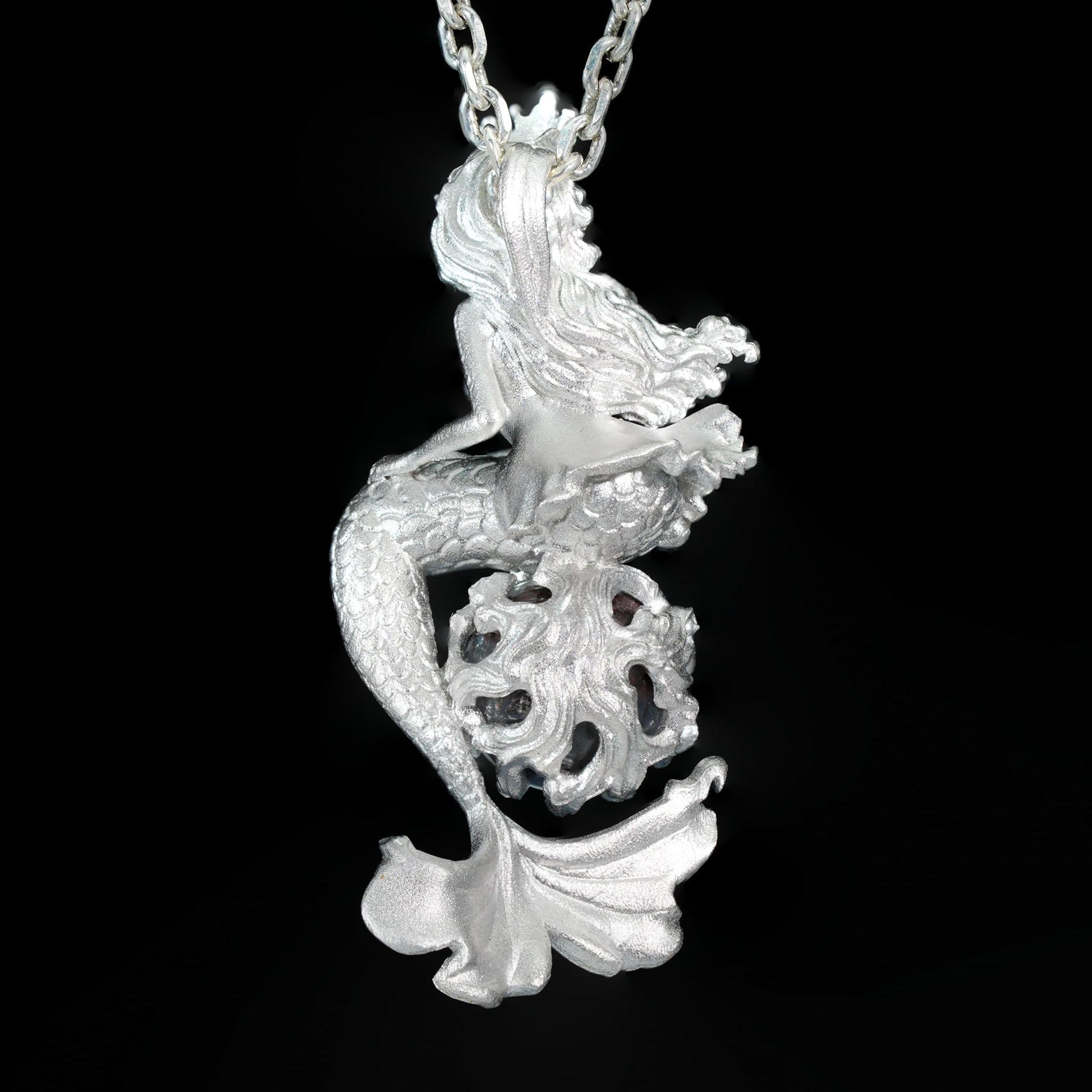 Ocean-Themed Mermaid Necklace | 925 Sterling Silver, Handmade | Crown, Seated Pose | Hand-Engraved Fin | Amulet | Gift for Her
