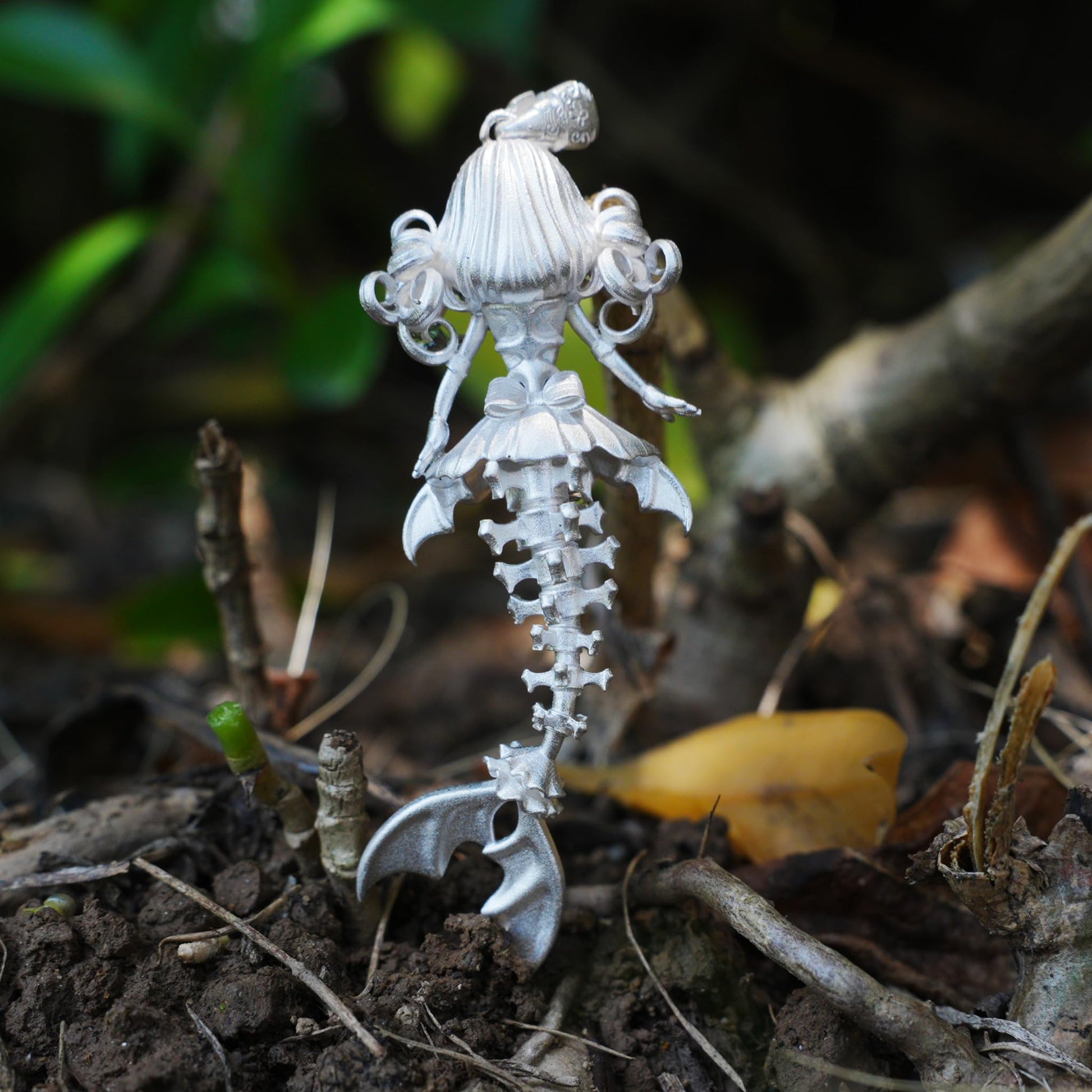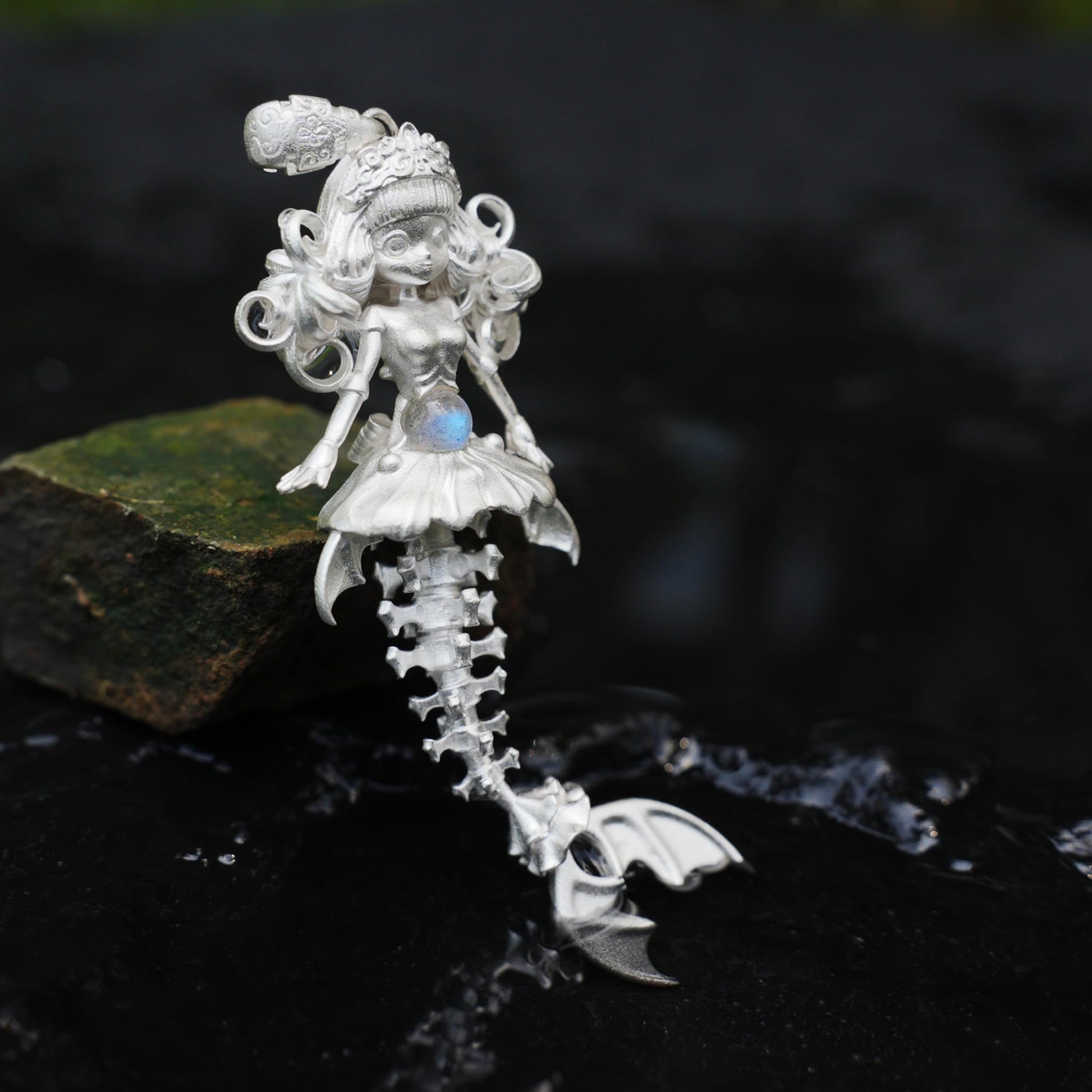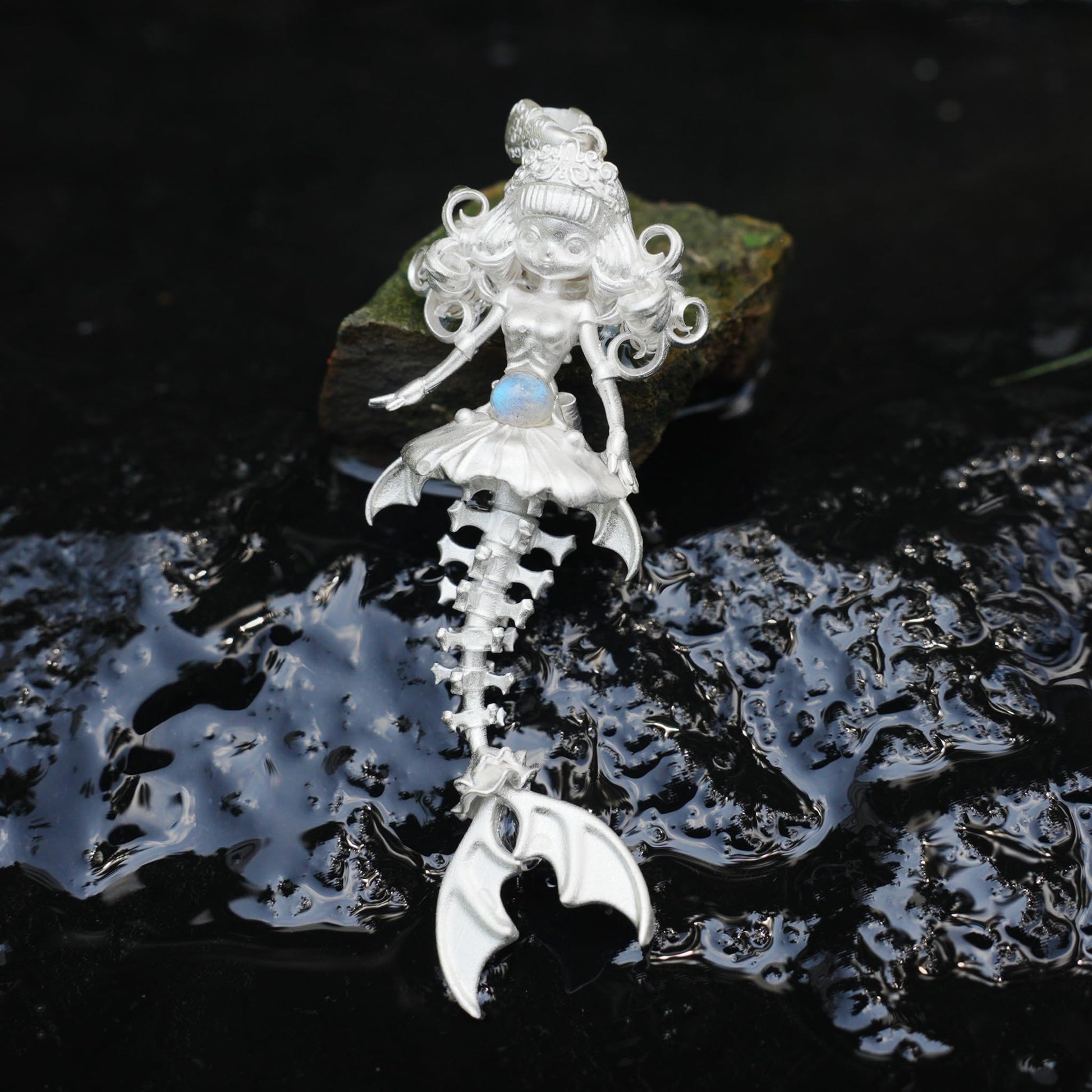 This pendant is inspired by mermaid bones — a delicate spine and tail fin that gently sway at the chest; the belly is set with an elongated labradorite that emits a cool blue glow, like moonlight splitting the sea, reminding us that true protection comes from the calm after self-discovery. 🌊💙