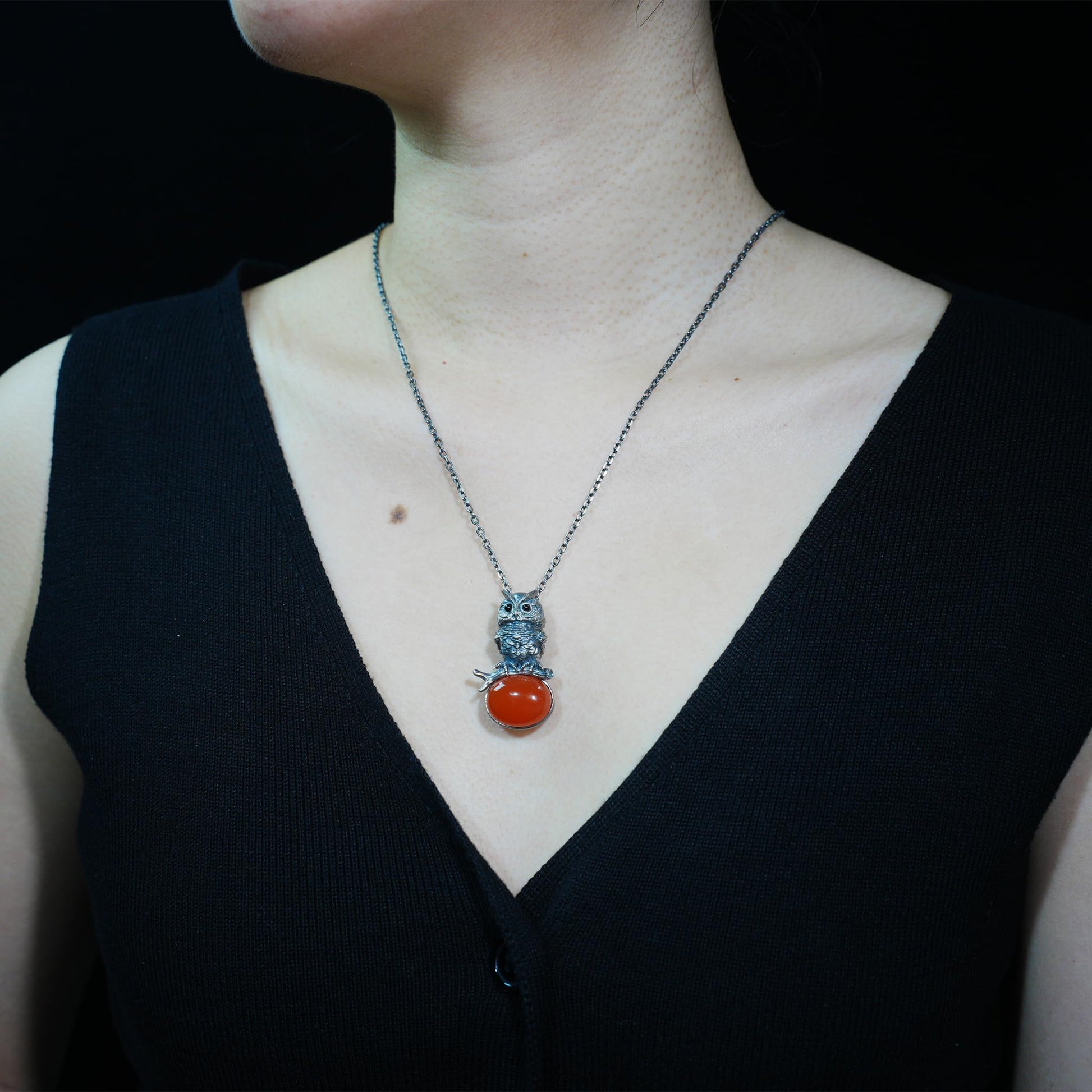 Owl Carnelian Pendant | Handmade 925 Sterling Silver Necklace with Onyx Eyes | Nature-Inspired Jewelry Symbolizing Wisdom & Courage | Artisan Gift