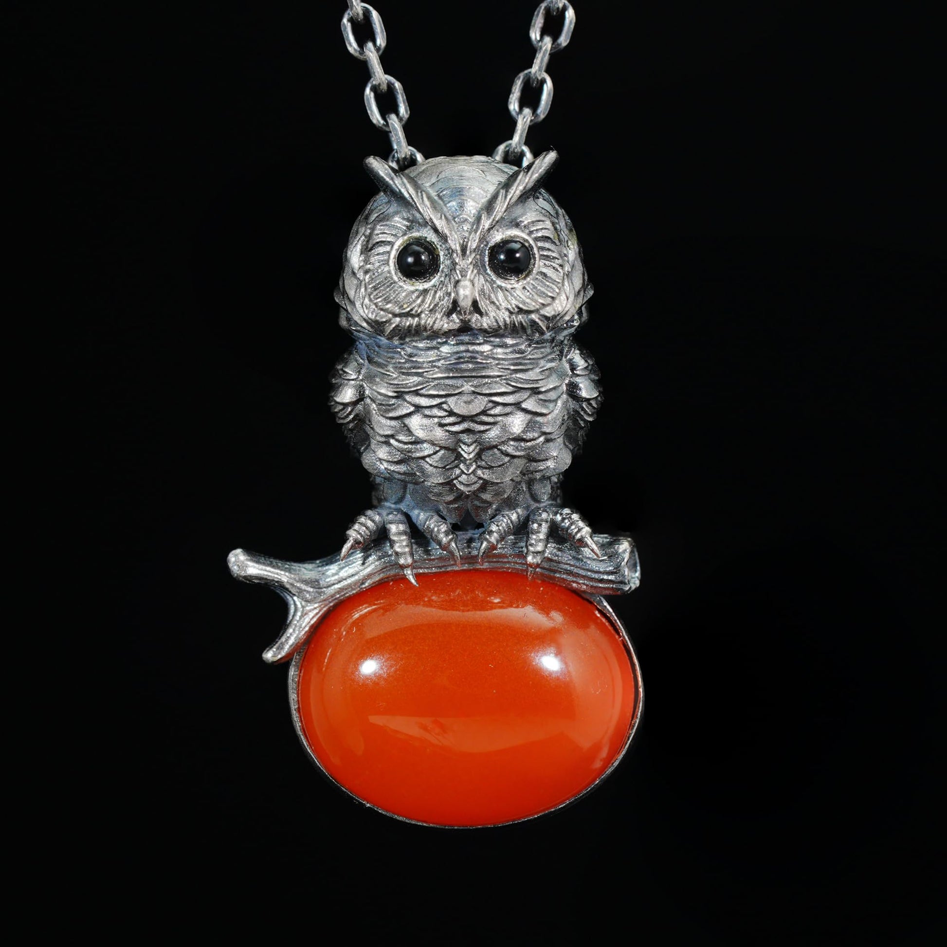 Perched on an evening branch, a small owl stands quietly. It is not noisy; in the dusk it watches with focus — gathering the day’s clutter and lighting the night’s inspiration. On its chest a translucent carnelian sits like a faintly glowing ember, showing warm orange-red tones in the light, as if pocketing the sunset. Wearing it is like carrying a night-reading guardian: a reminder to keep clarity, focus and gentle strength amid busy noise. 🌙✨