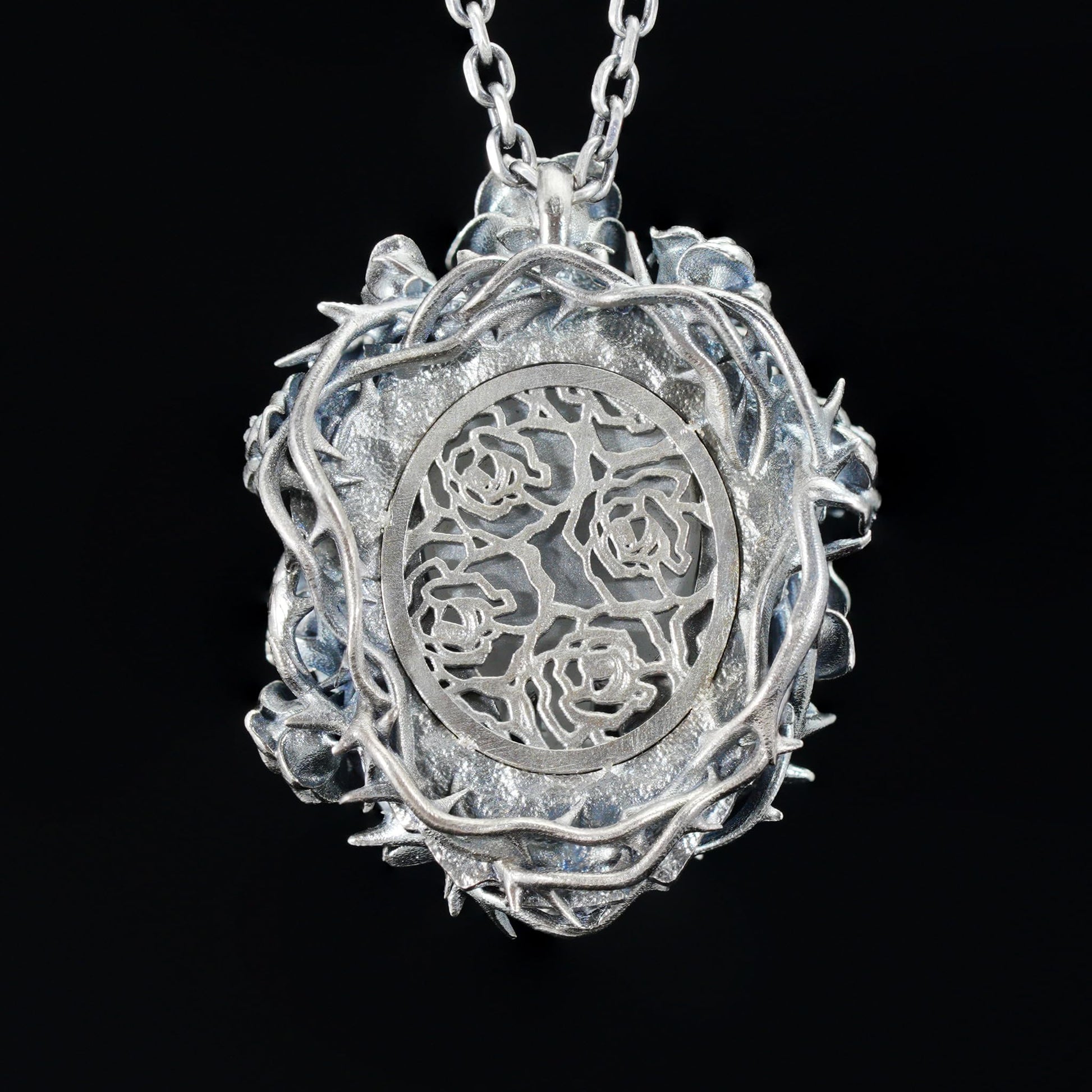 She closes her eyes and drifts to sleep inside a wreath of blooming roses. The wind stills and sounds slow down; all the bustle is kept outside by petals and thorns. The clear white crystal carves the girl’s face like a gently guarded heart; silver roses encircle her, creating a private place of calm. Wear it as a reminder: even amid busyness, give your soul a flower and a quiet moment.