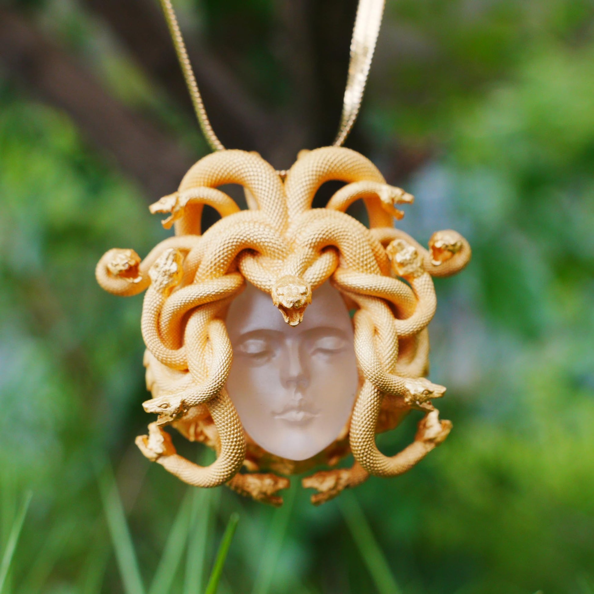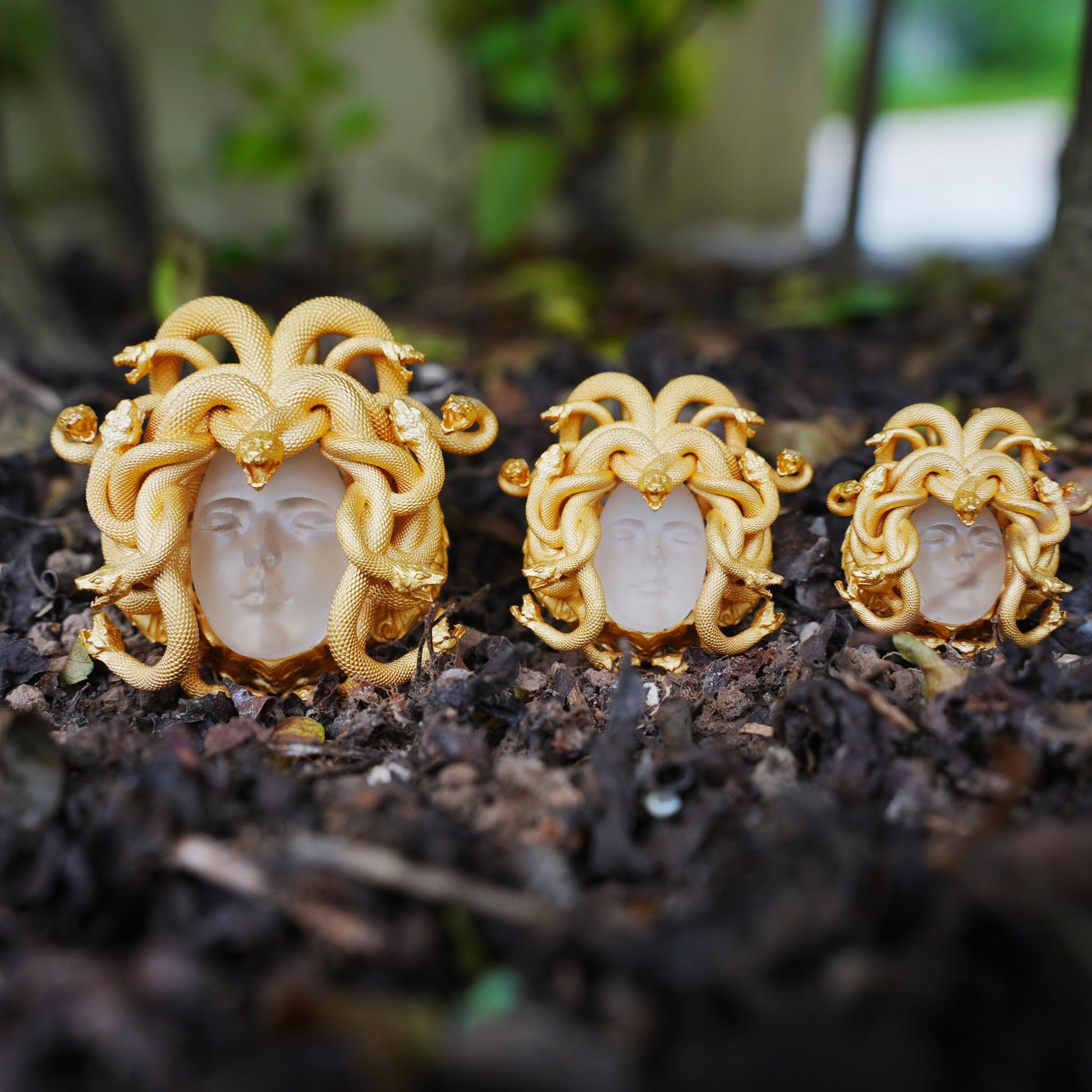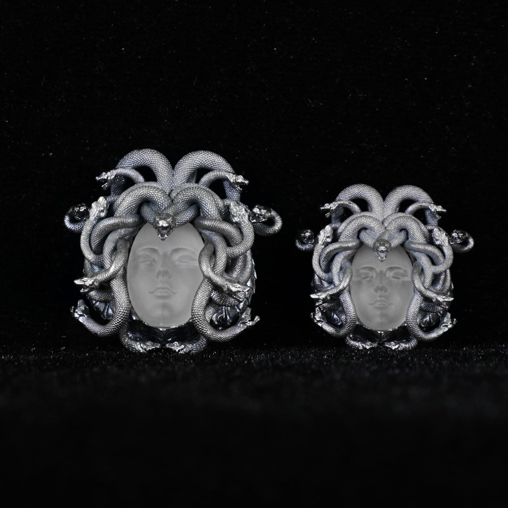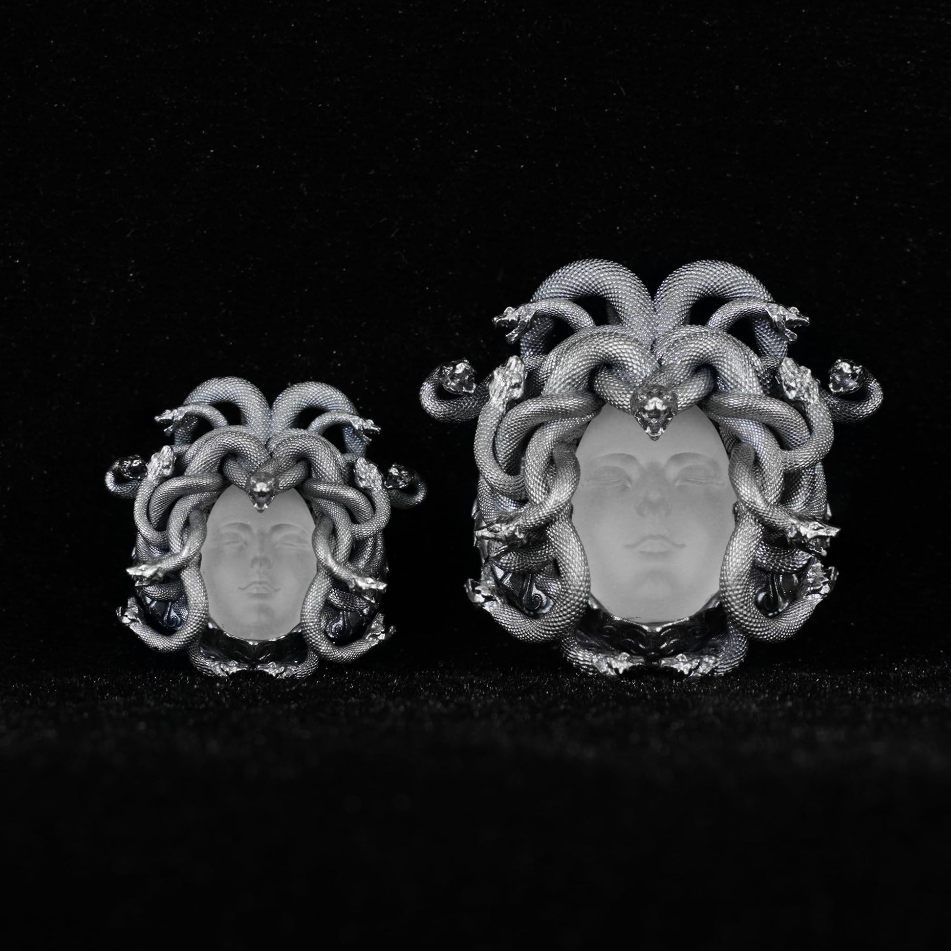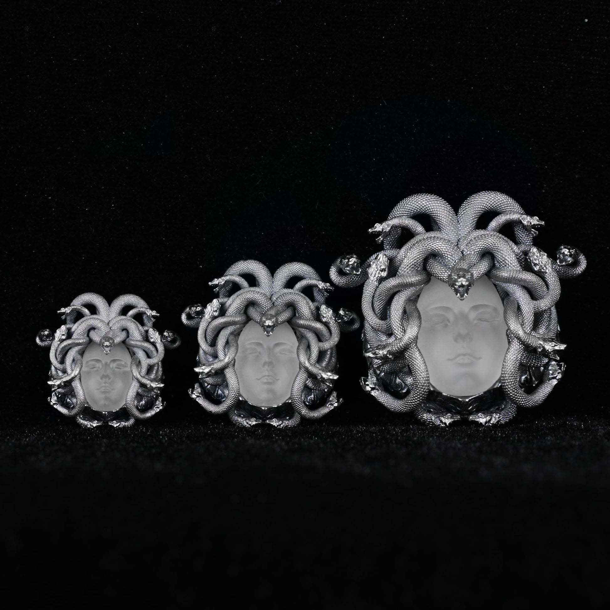 Each piece features a lifelike Medusa face, hand-carved from natural white crystal,
