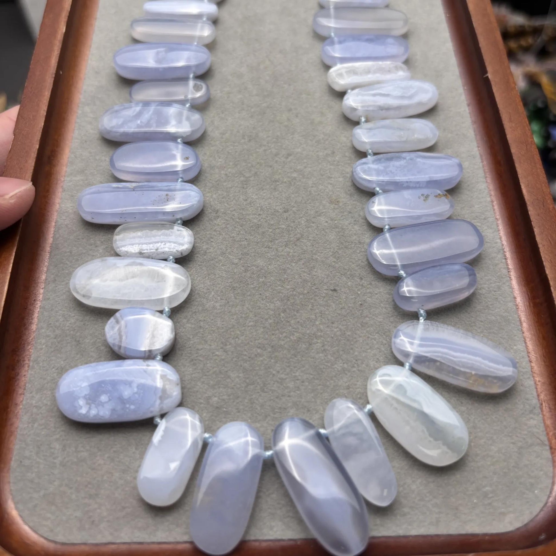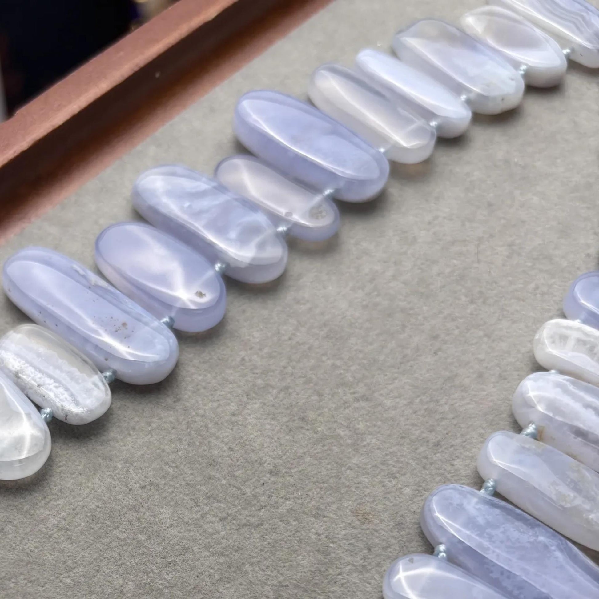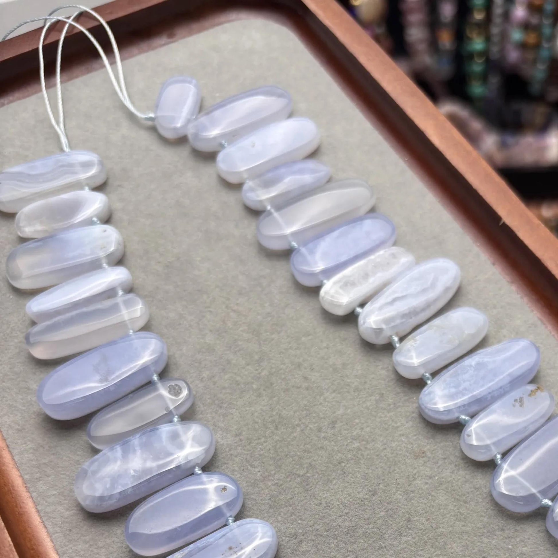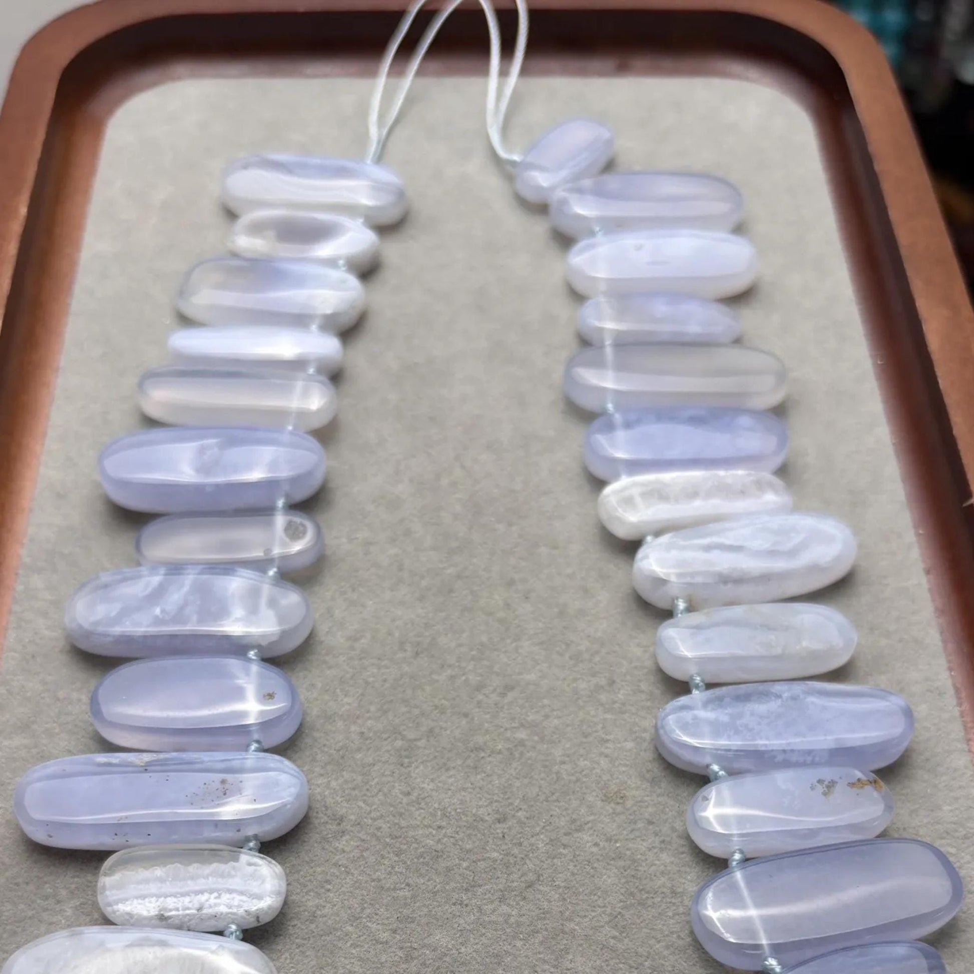 ✨ Entdecken Sie die beruhigende Schönheit von natürlichem Blauachat Lace! Diese polierten flachen Oval-Perlen mit feinen blauen und weißen Bänderungen sind perfekt für DIY-Schmuckprojekte. Als Heilstein bekannt, fördert Blauachat Ruhe, Klarheit und innere Balance.
