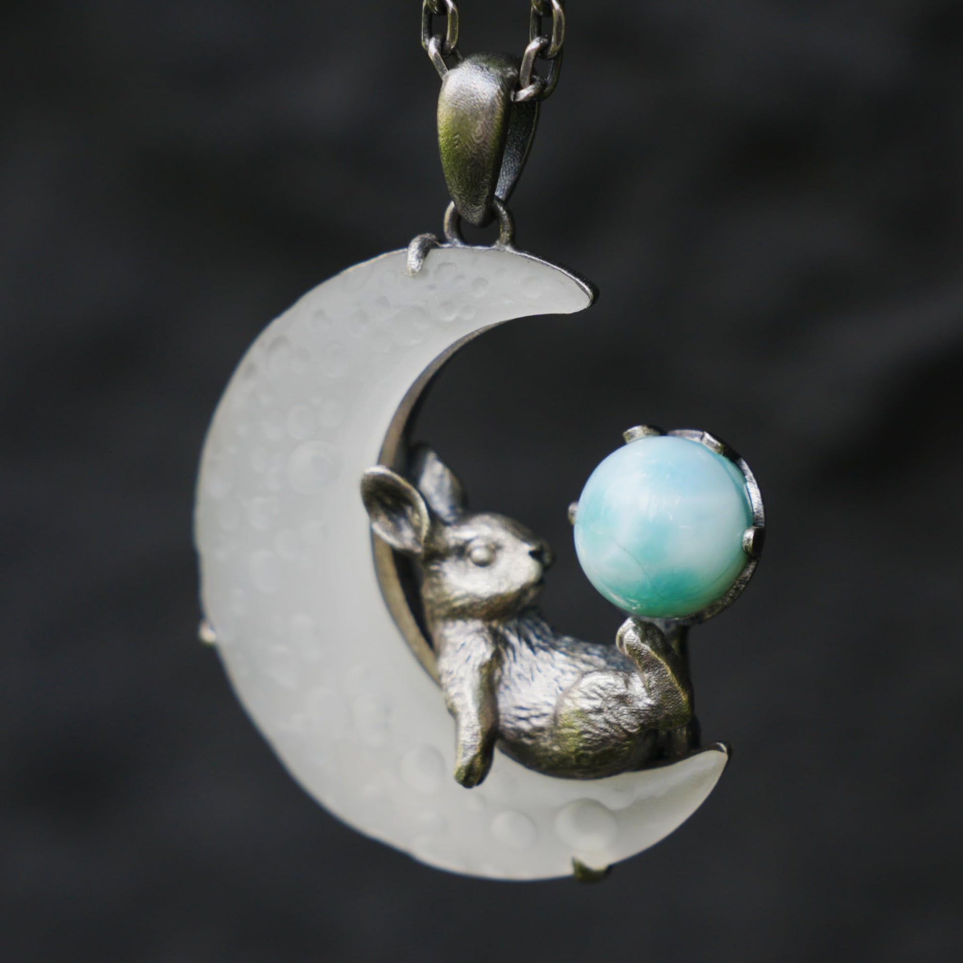 Rabbit Pendant with Larimar & White Quartz Moon | Handcrafted Fantasy Jewelry | Celestial Totem Gift for Serenity