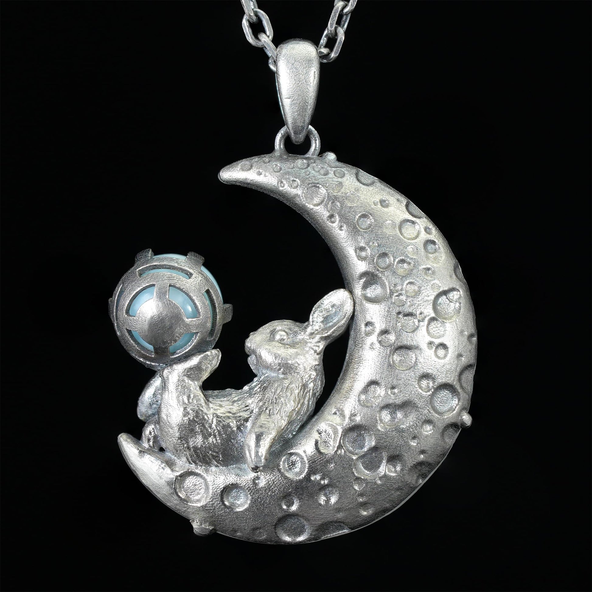 Design: Crescent moon carved from translucent white quartz, with a silver rabbit holding a polished larimar orb — symbol of rebirth and emotional calm