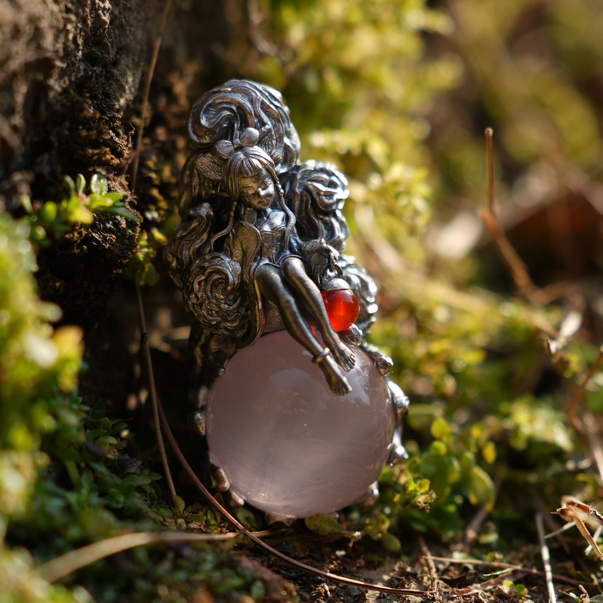 Highlight: Hand-sculpted silver girl seated on a natural crystal orb, wrapped in flowing hair, holding a carnelian lantern — exquisitely detailed with rich symbolic meaning