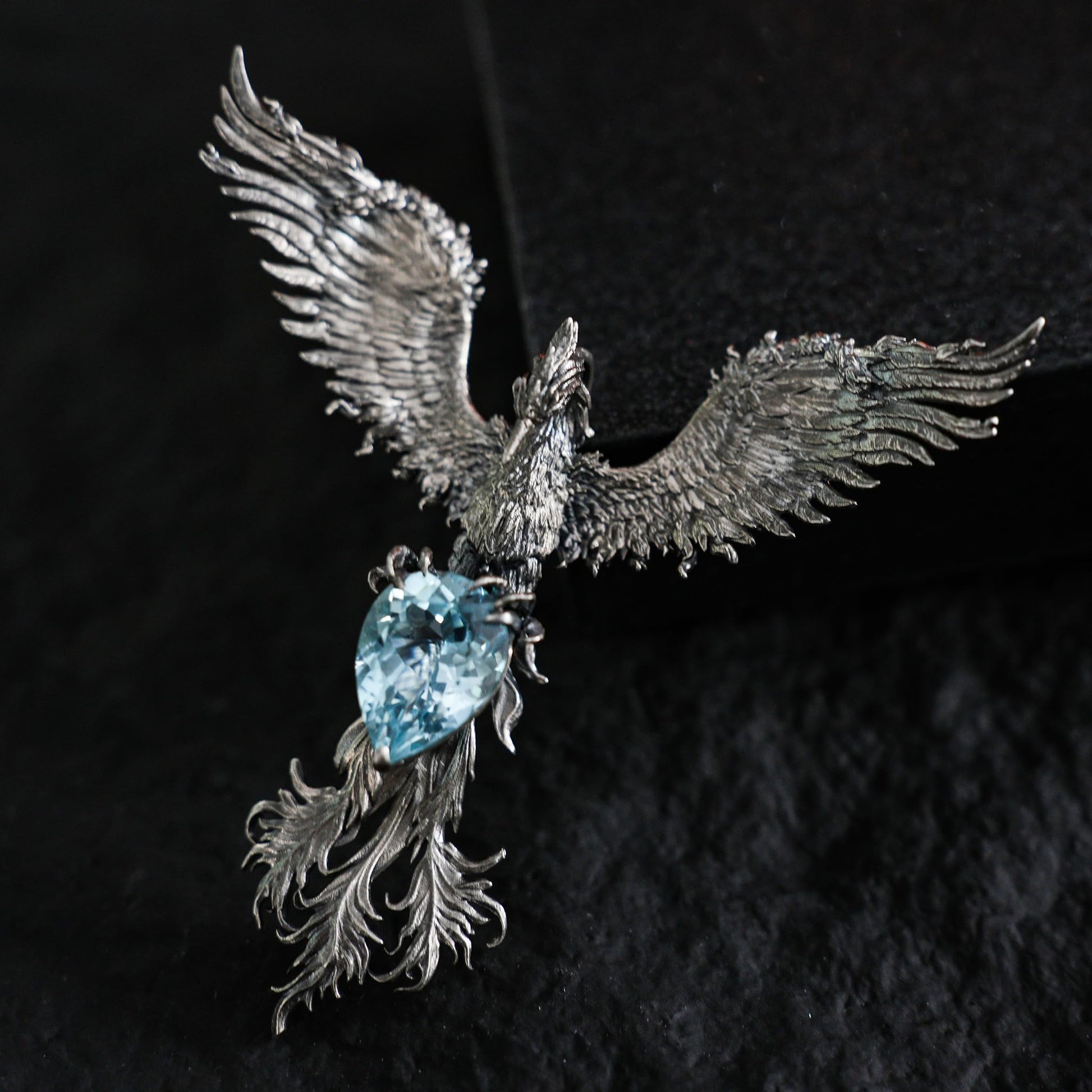 Handmade Phoenix Pendant Brooch | 925 Silver Jewelry with Aquamarine | Symbol of Rebirth & Strength | Gothic Fantasy Gift for Her