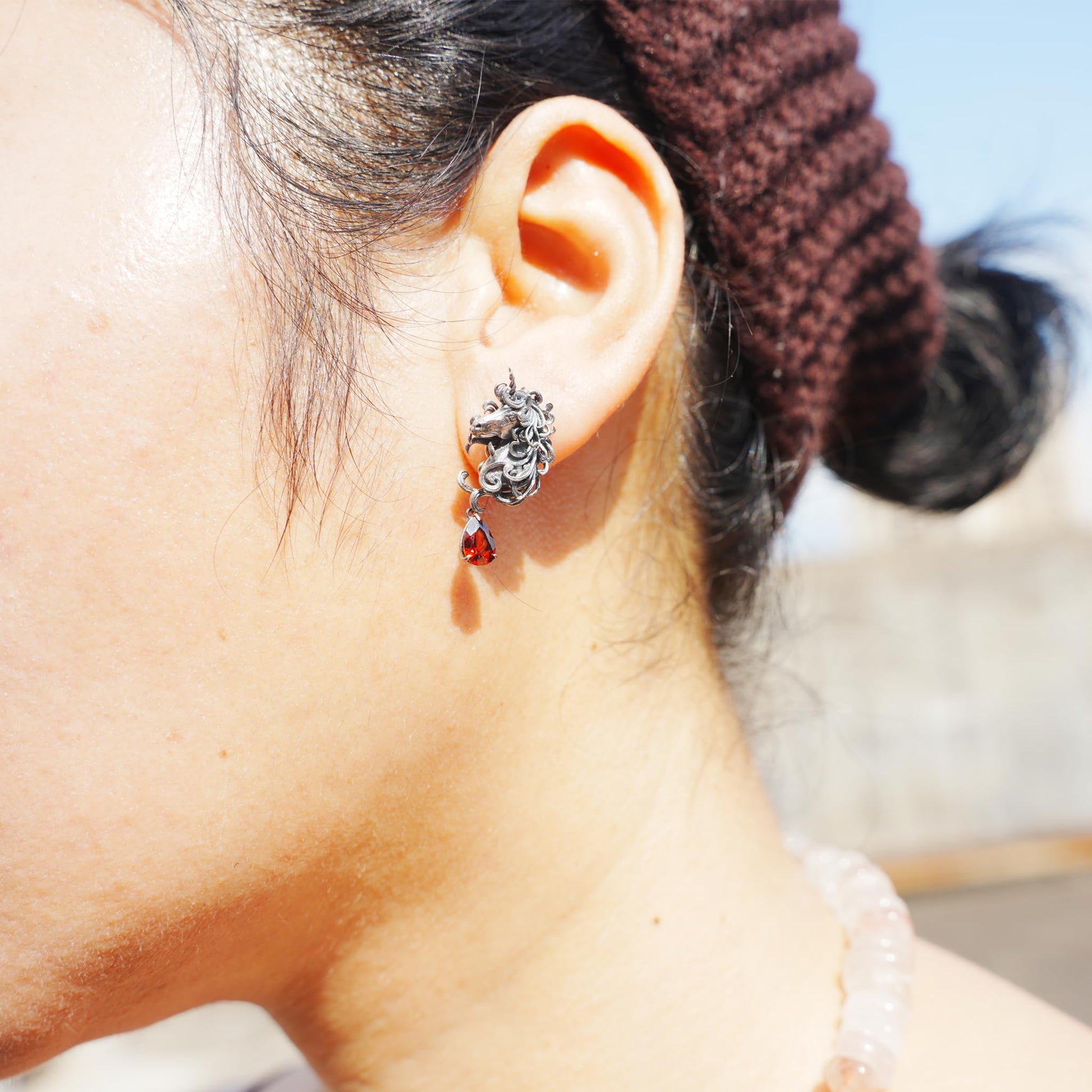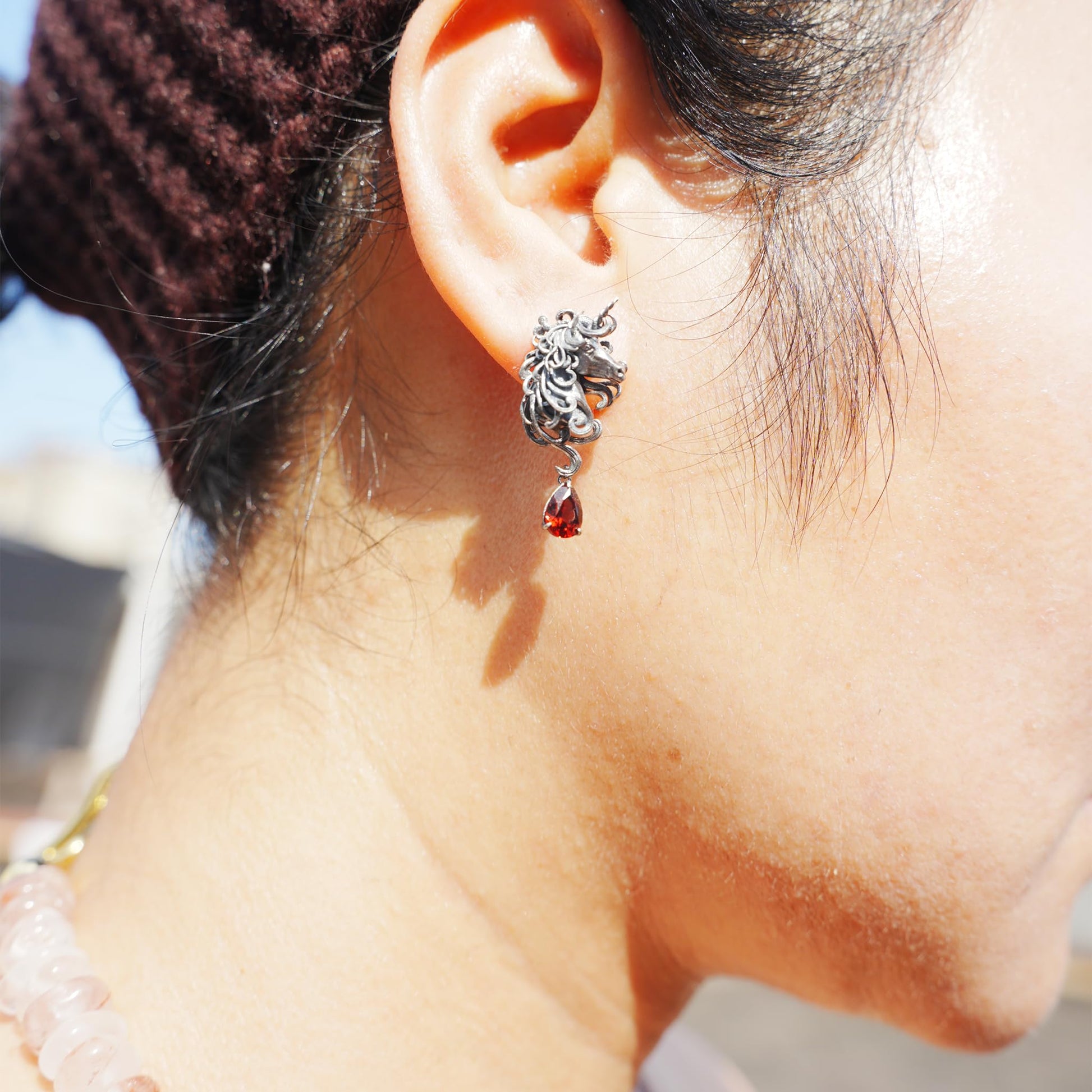 Unicorn Earrings with Garnet Drop | Handcrafted Celtic Fantasy Jewelry | Symbolic Gift of Vow & Protection